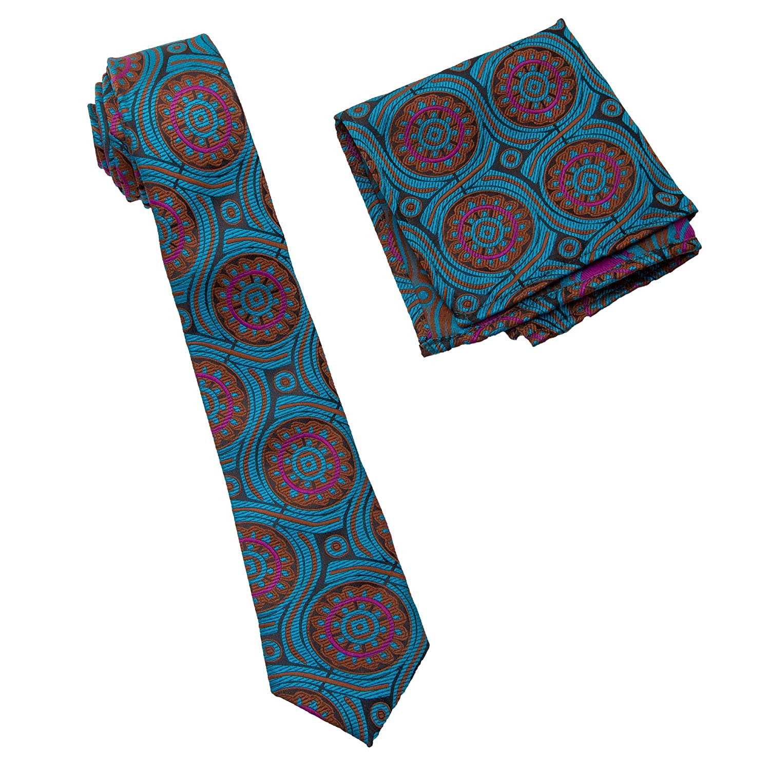 These are the dimensions of the tie and pocket square: the tie measures 60 inches in length and 3 inches in width, while the pocket square measures 11 inches by 11 inches.