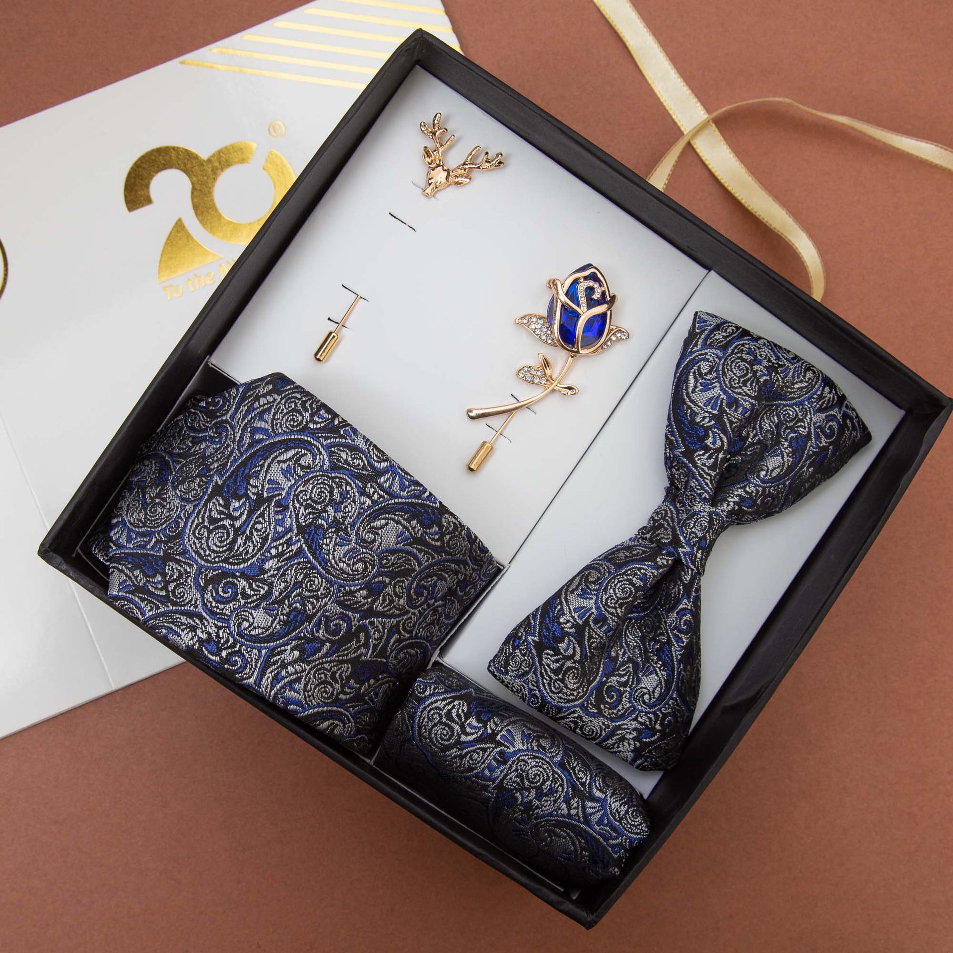 This stunning Necktie Set is designed to elevate any gentleman's wardrobe, offering a complete ensemble of a tie, pocket square, cufflinks, and lapel pins.