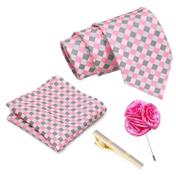 This stunning Necktie Set is designed to elevate any gentleman's wardrobe, offering a complete ensemble of a tie, pocket square, cufflinks, and lapel pins.