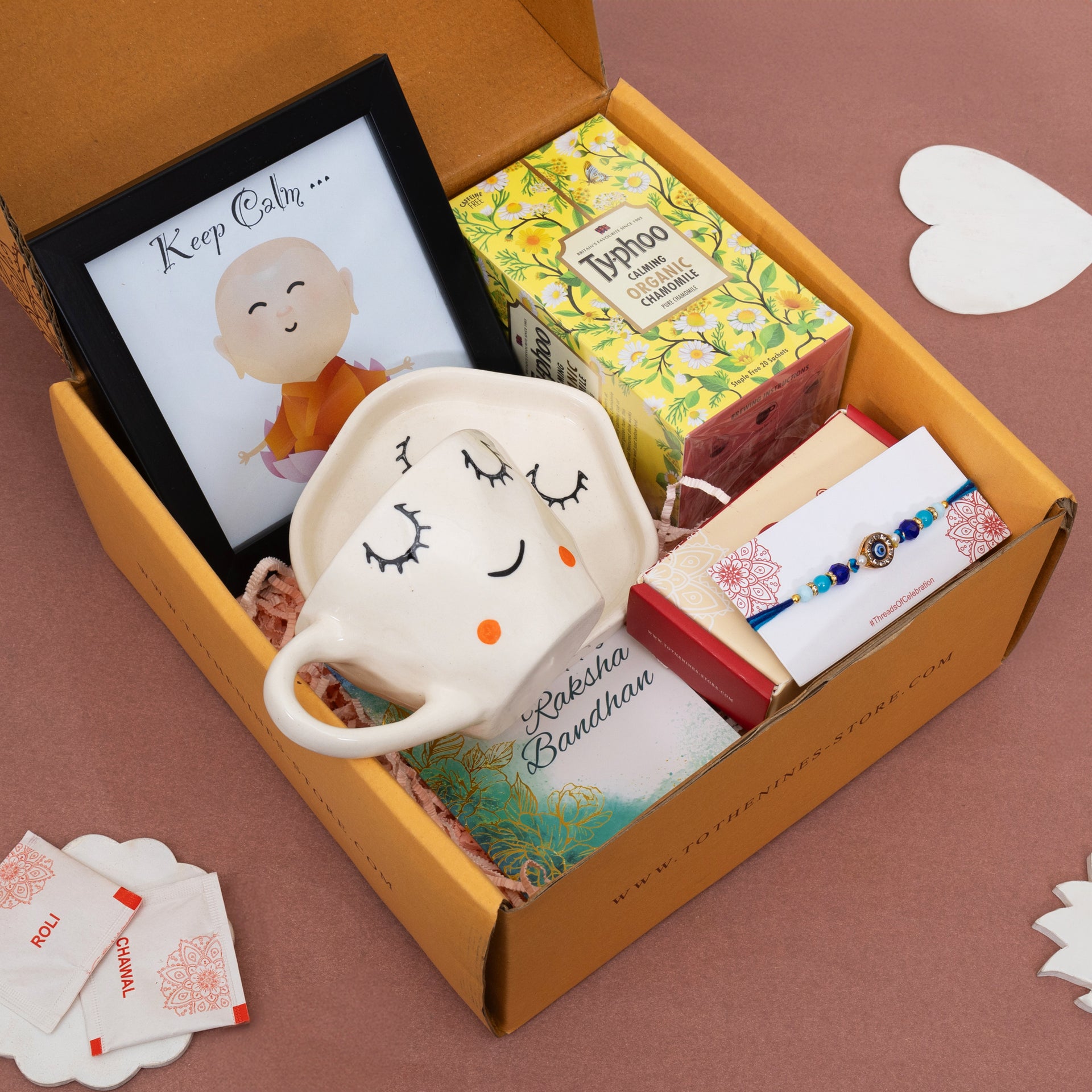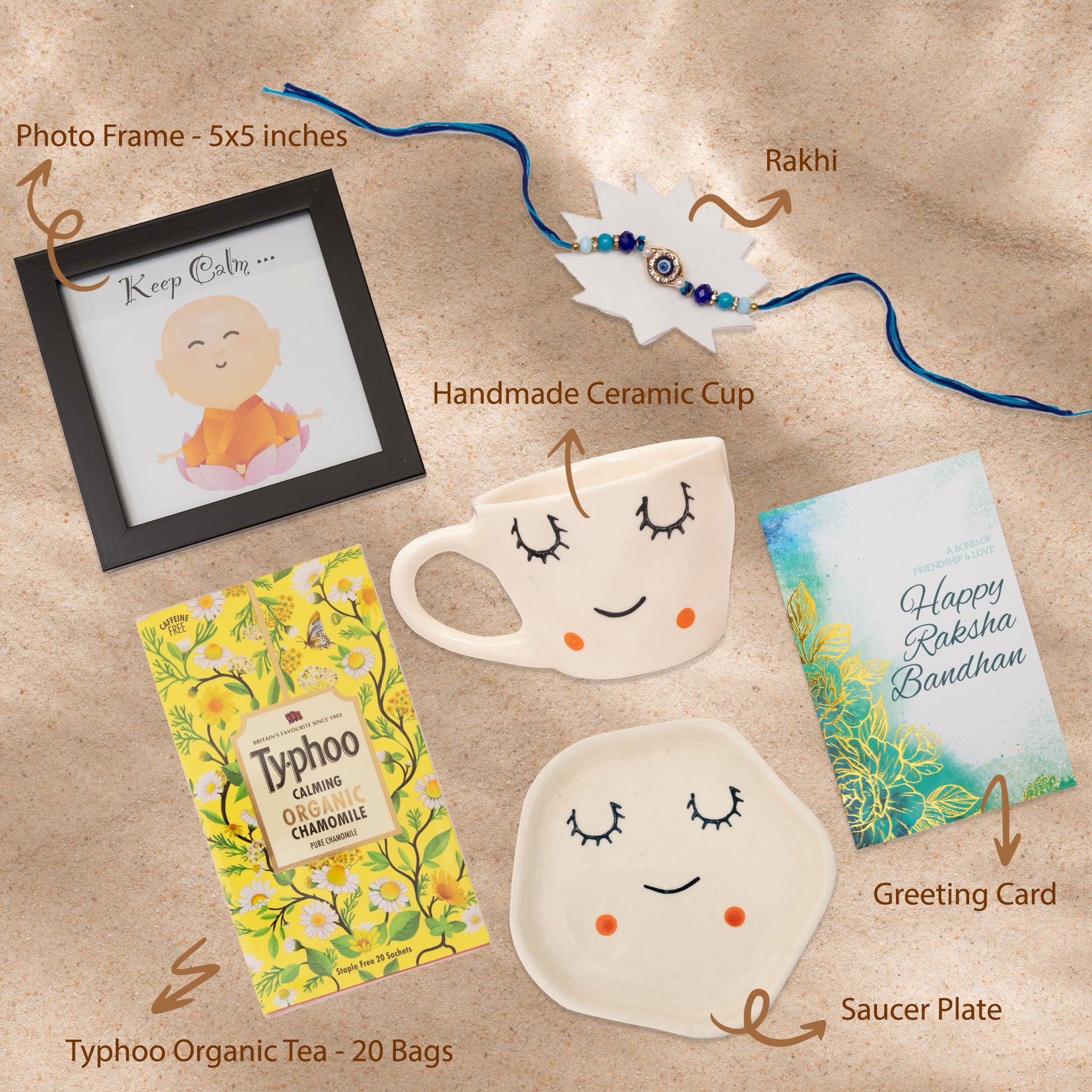 Contents: The package consists of Rakhi, 1 Photo Frame, 1 Printed Handmade Mug with Saucer Plate, 1 Green Tea Box, Tilak Material and a Greeting Card.