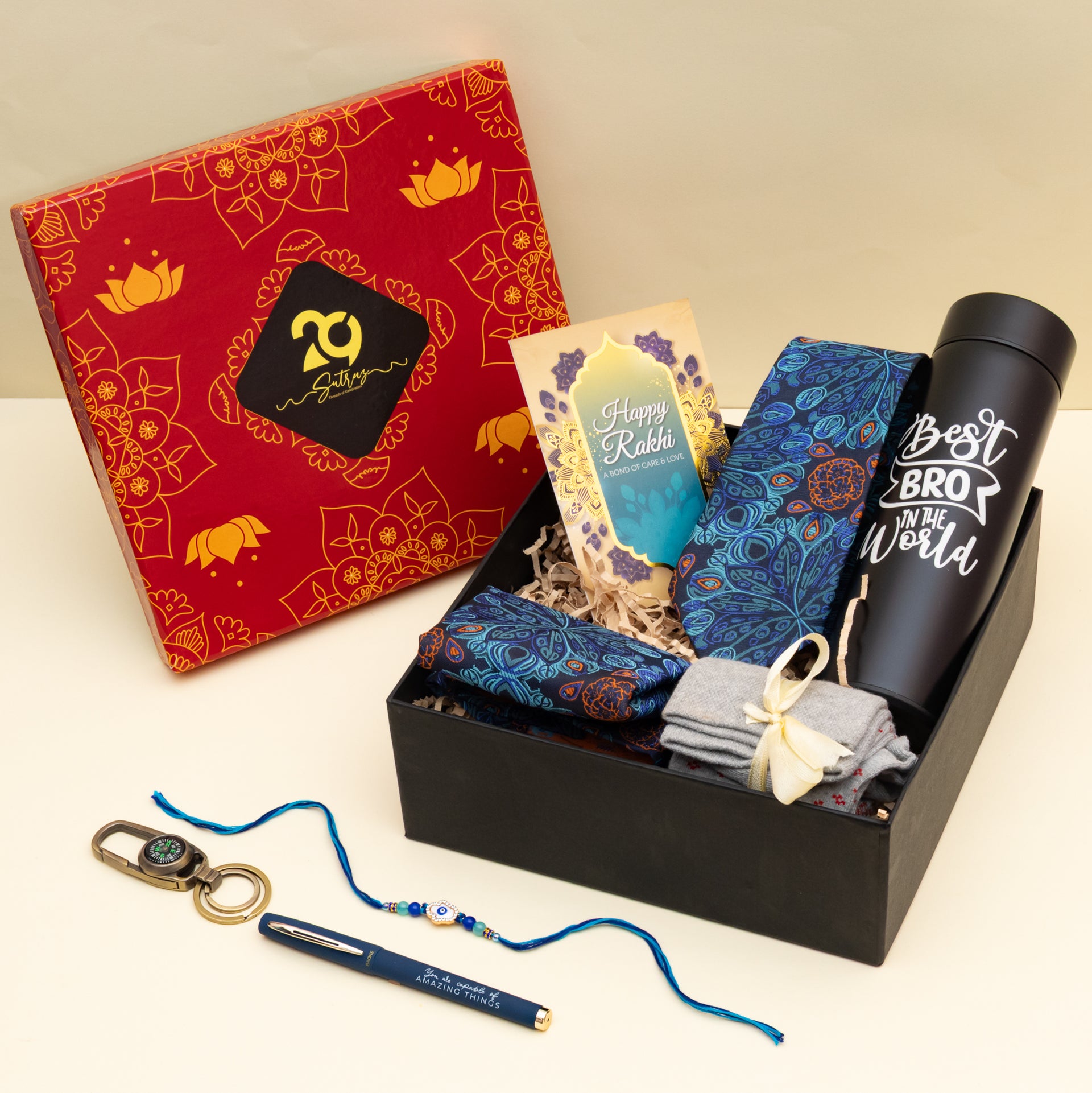 Contents: The package consists of a Rakhi, Tie set,1 Pair of Socks,1 Water Bottle, Pen, Keychain, Tilak Material and a Greeting Card.