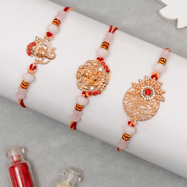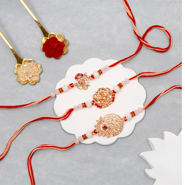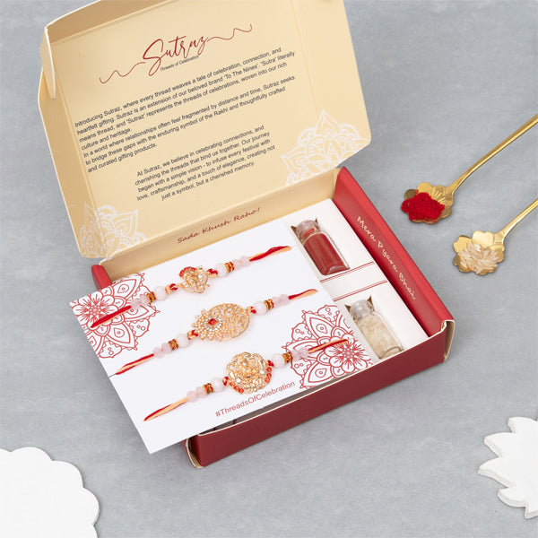 Contents: The package consists of 3 Rakhi for brother, Tilak Material & a Greeting Card. Thoughtful Packaging: Each Rakhi is packed in a beautifully crafted box as shown in the images.