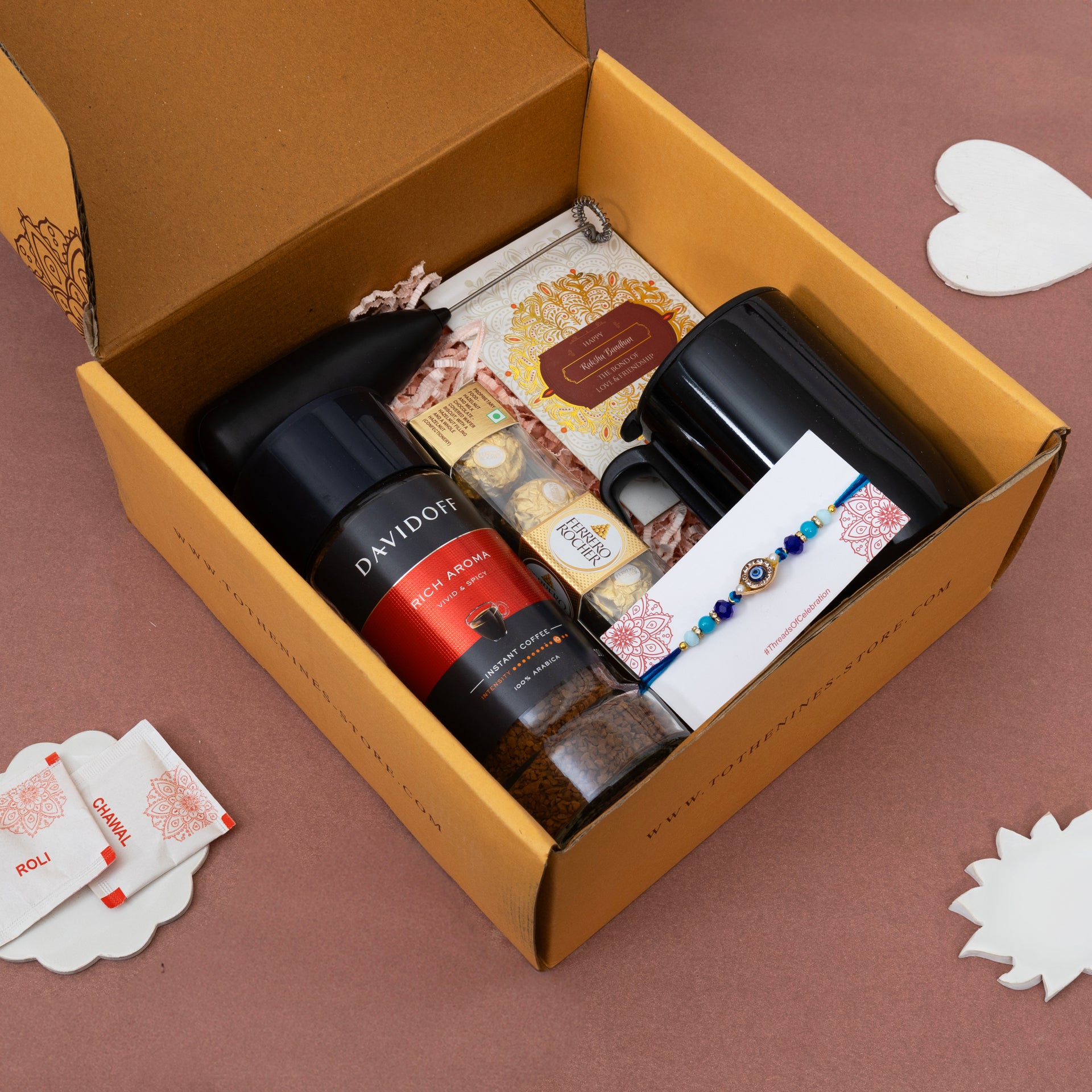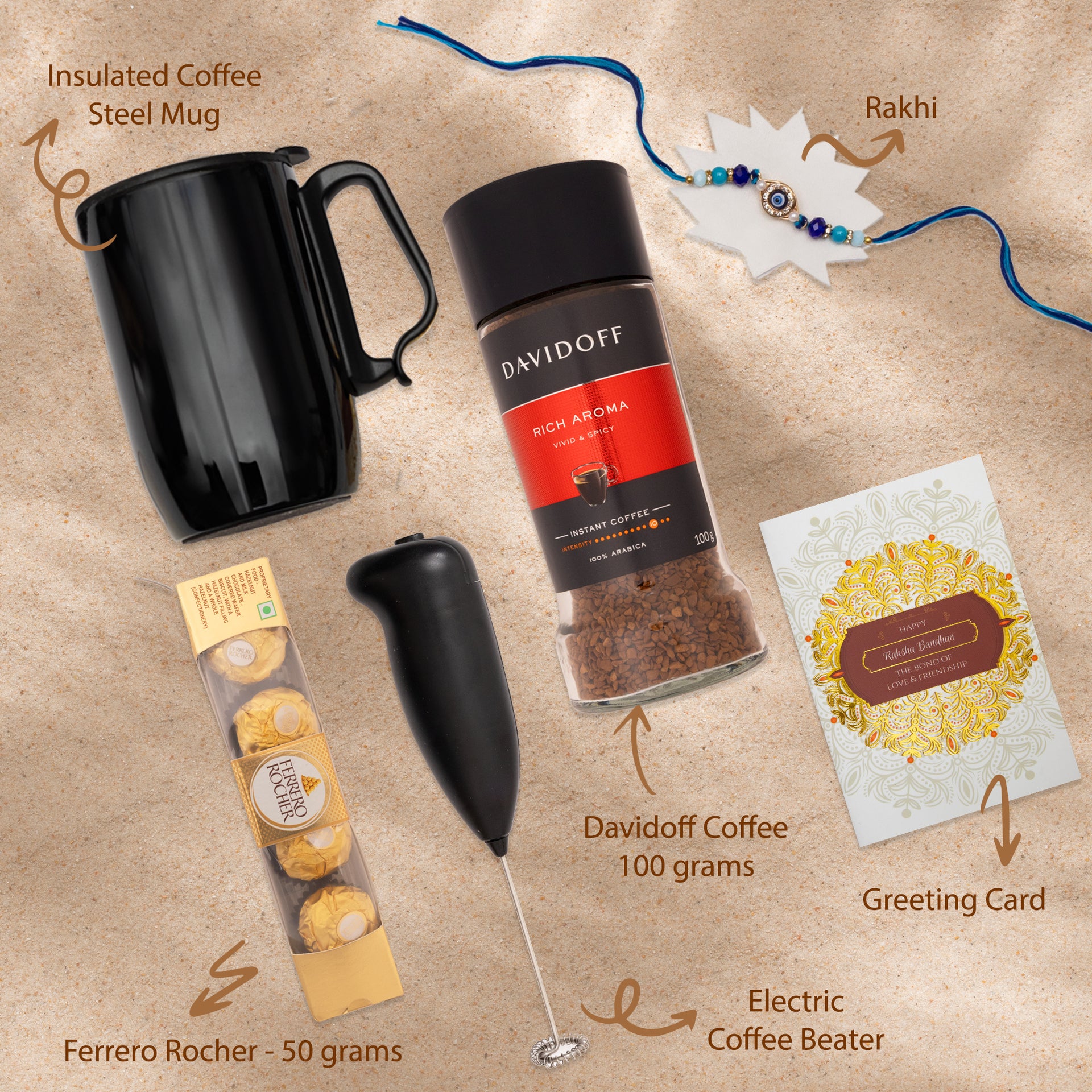 Contents: The package consists of Rakhi, Davidoff Rich Aroma Coffee, Ferrero Rocher, Coffee Beater, Insulated Steel Mug, Tilak Material and a Greeting Card.