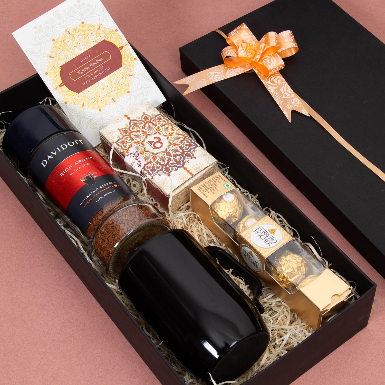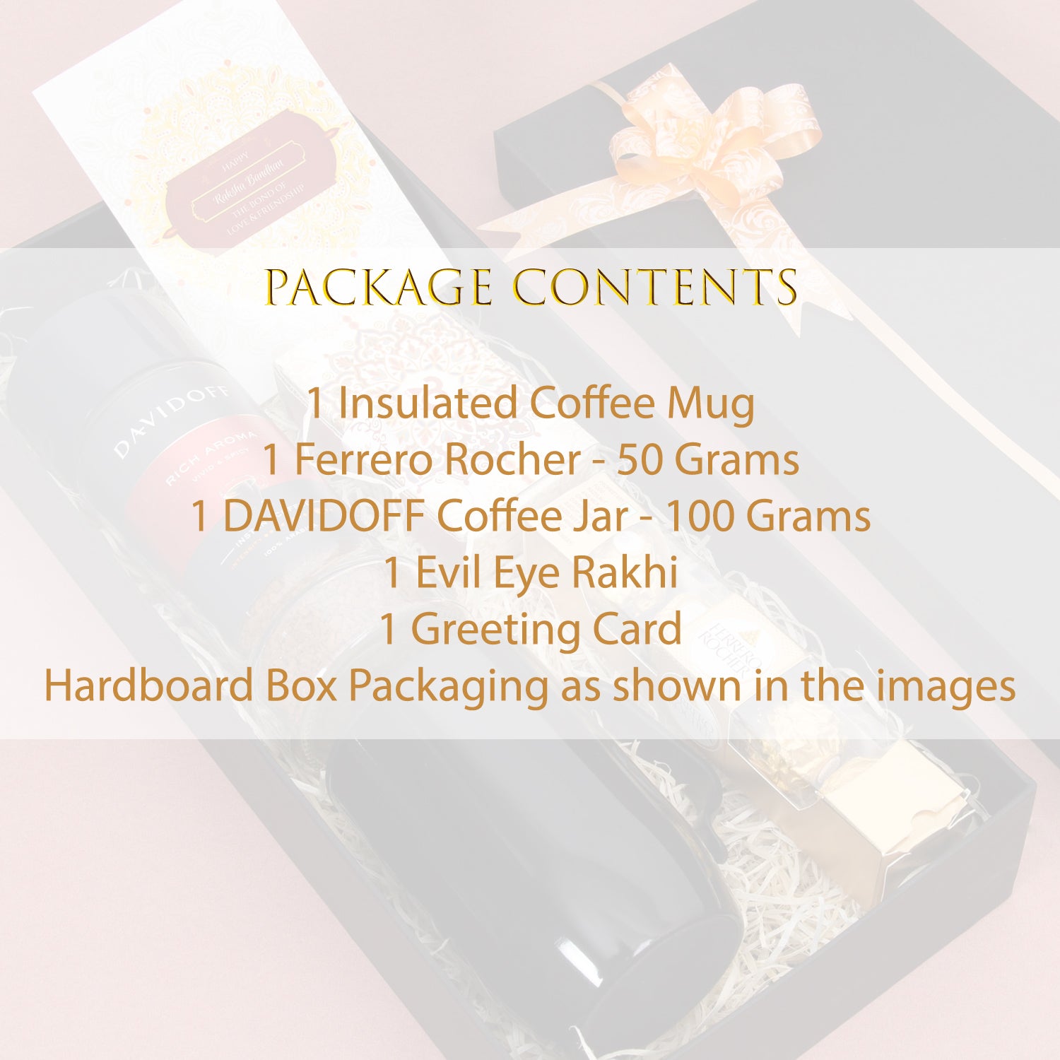 The package consists of 1 Insulated Coffer Mug, 1 Ferrero Rocher - 50 Grams, Davidoff Coffee Jar -100 Grams, 1 Evil Eye Rakhi with, Tilak Material & a Greeting Card.