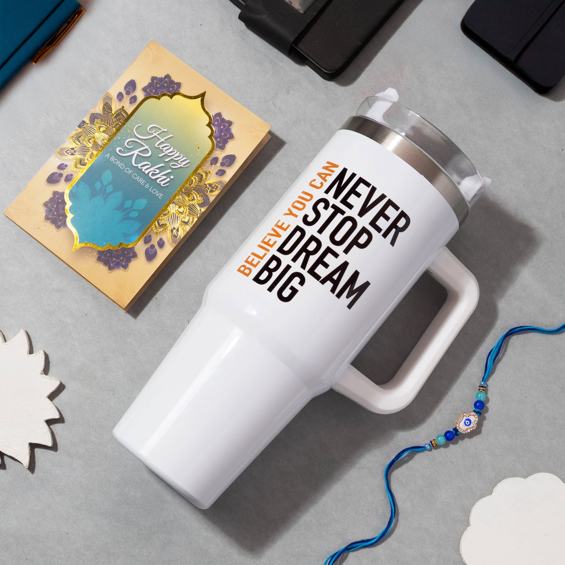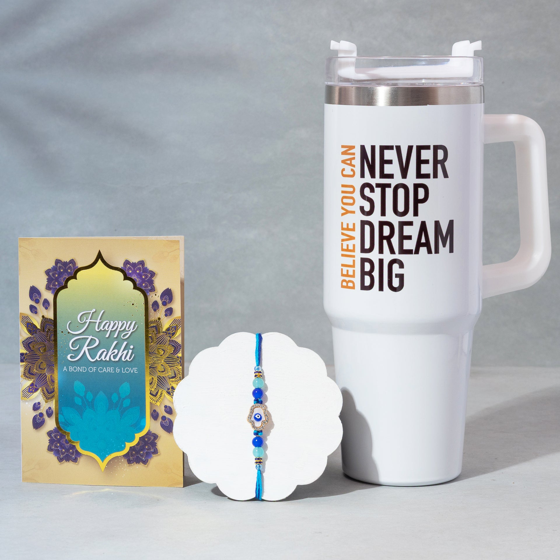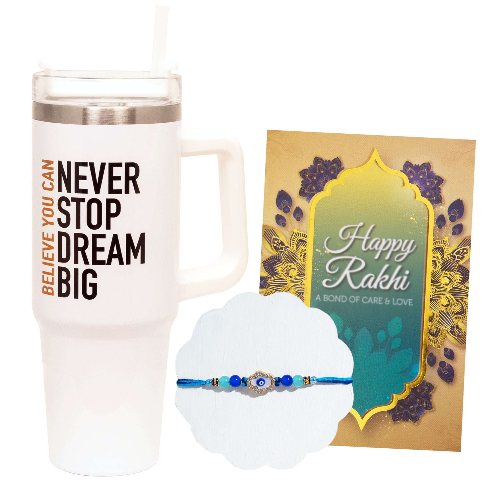 CONTENT : The package consists of Rakhi for brother With Tumbler With Handle Straw & Lid, Tilak Material & Greeting Card.